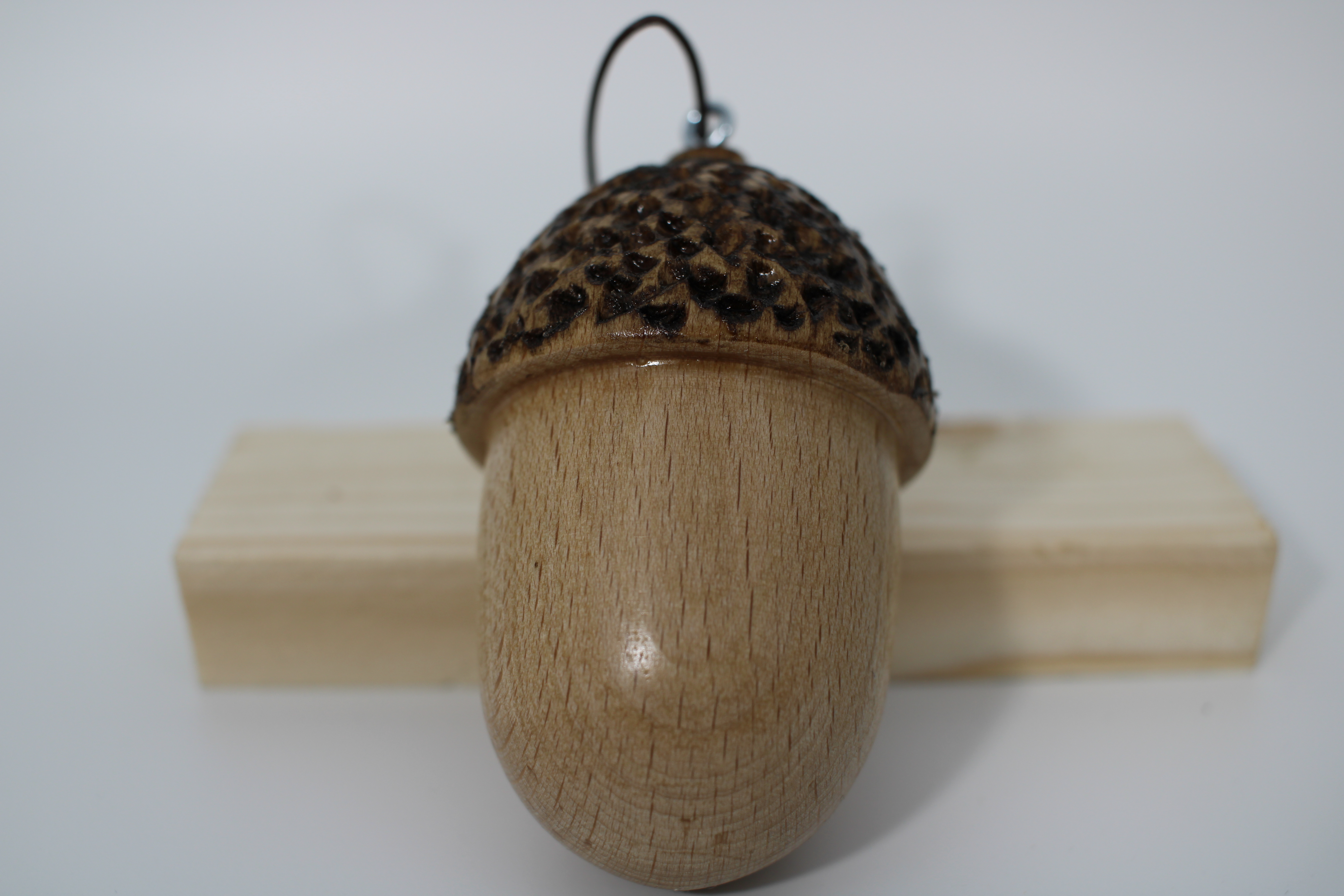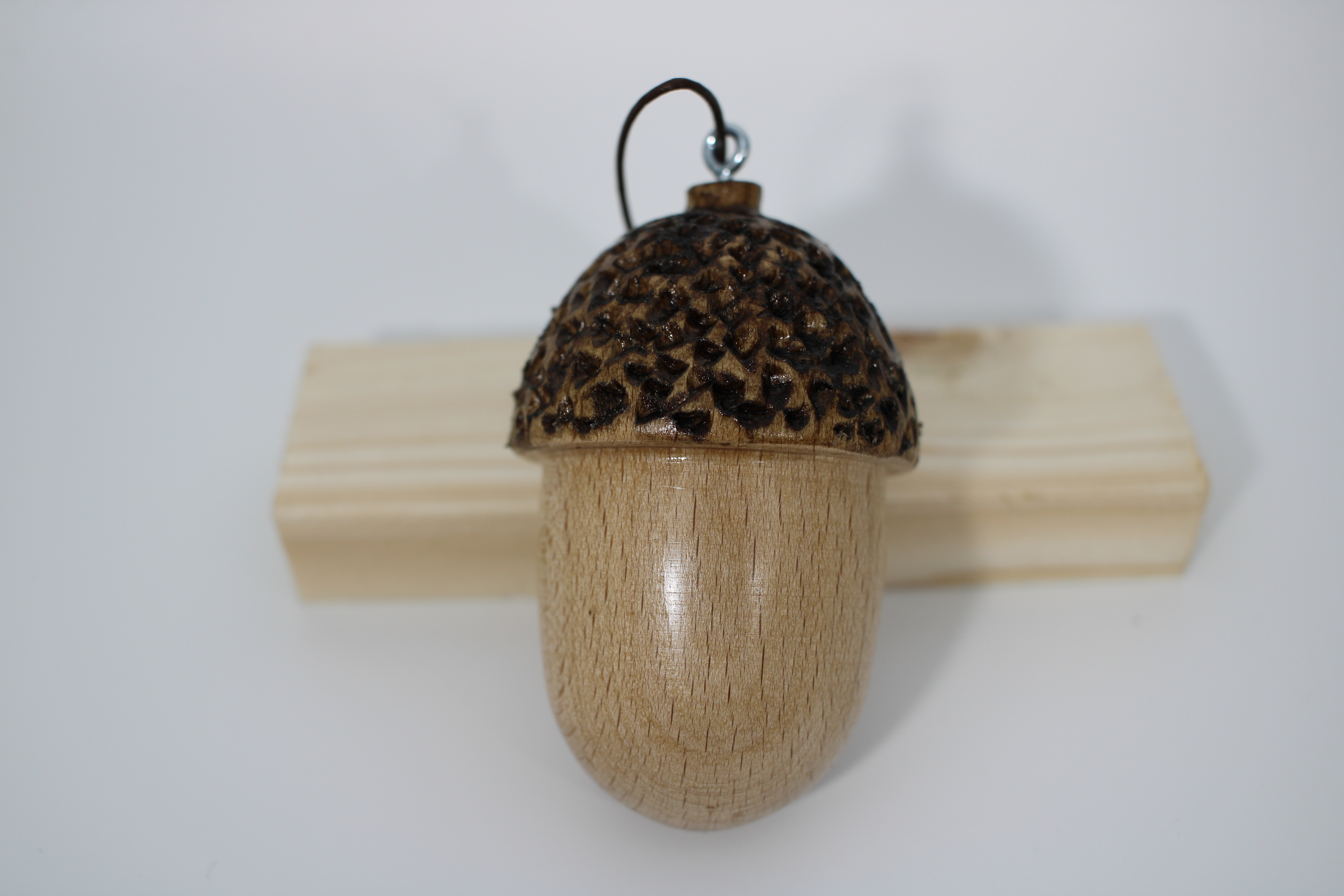 Holz mit Klarlack lackiert. Die Eichel hat einen Aufhänger damit man die Eichel z.B. an einen Strauß hängen kann.