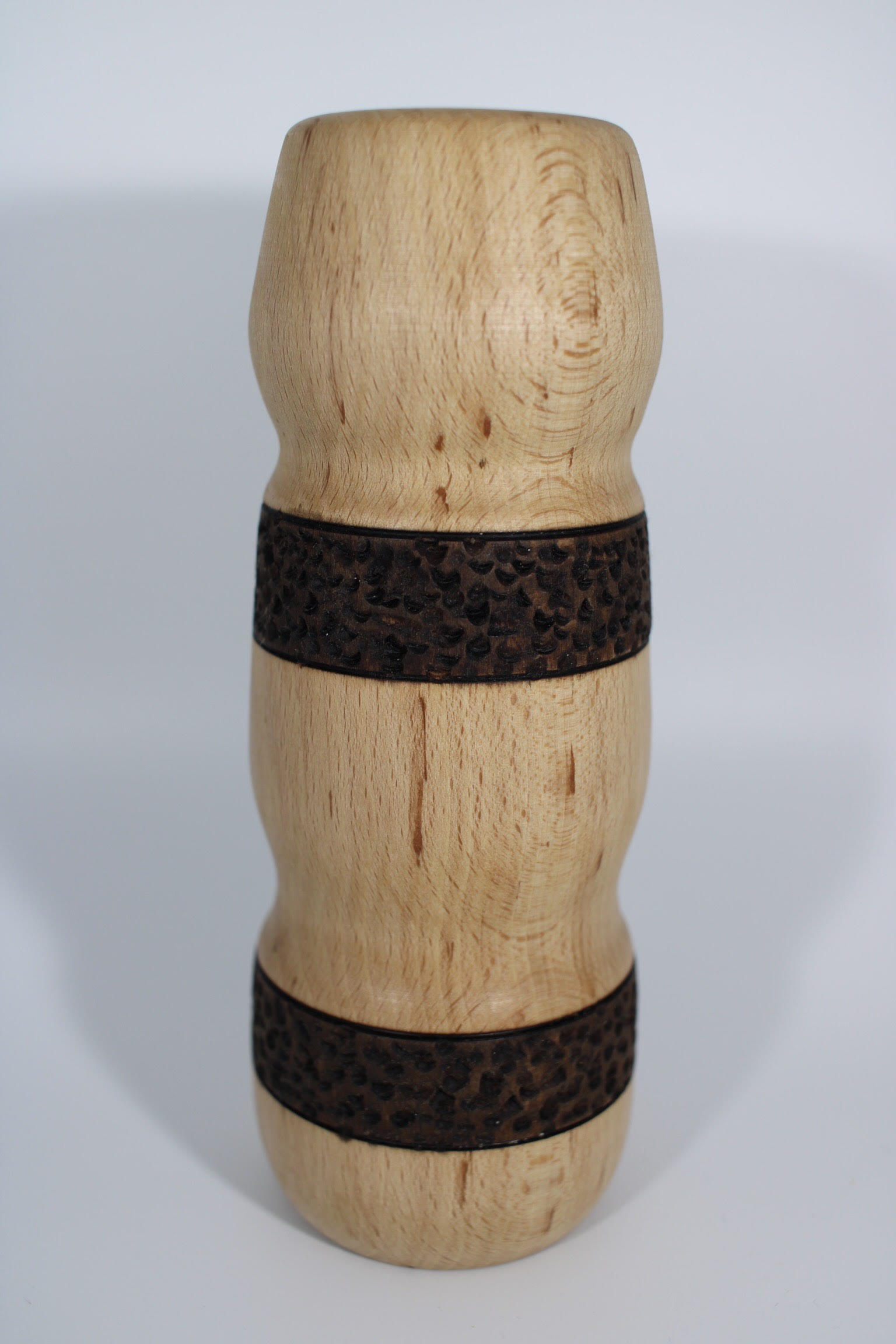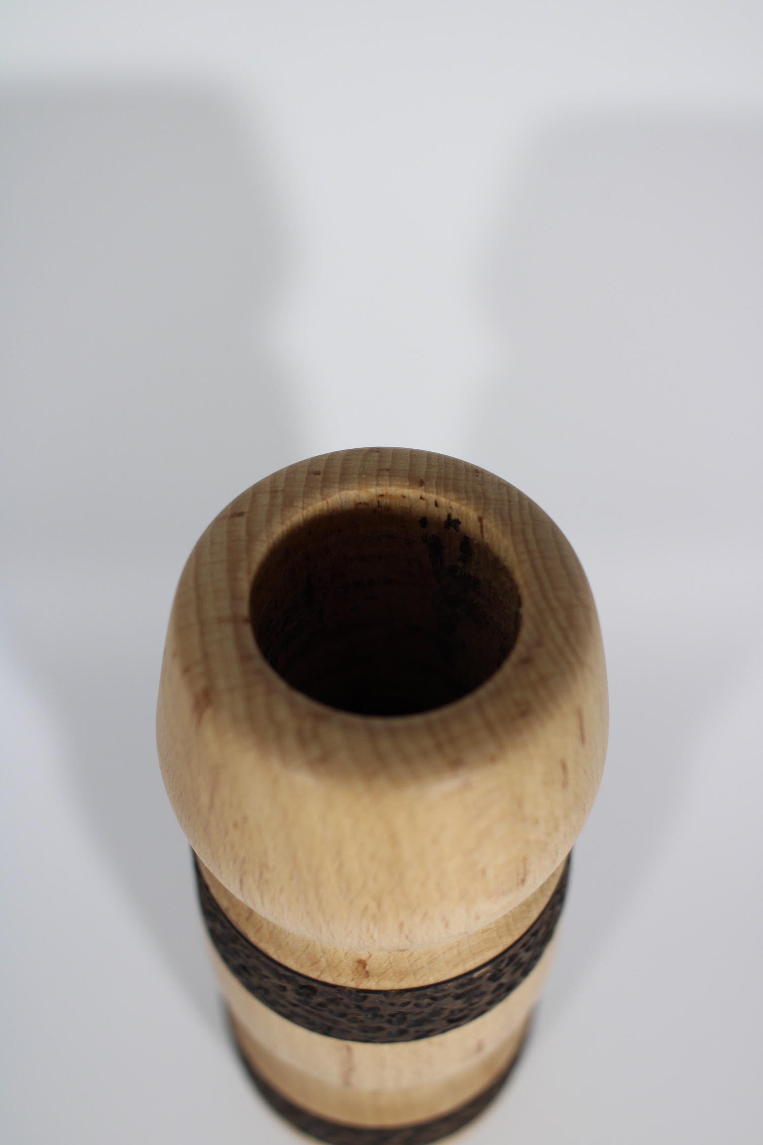 Farbe: Buche natur. Die Ringe sind in Nussbaum gebeizt Holzart: Buche Maße/ cm:: L= 17, D= 5 Maße/ cm: Glaseinsatz: L= 100, D= 3 Gewicht/ g: 259 Sonstiges: Die Holzvase ist mit Klarlack lackiert. Die Vase hat einen Glaseinsatz und kann dadurch für Frischblumen genutzt werden.