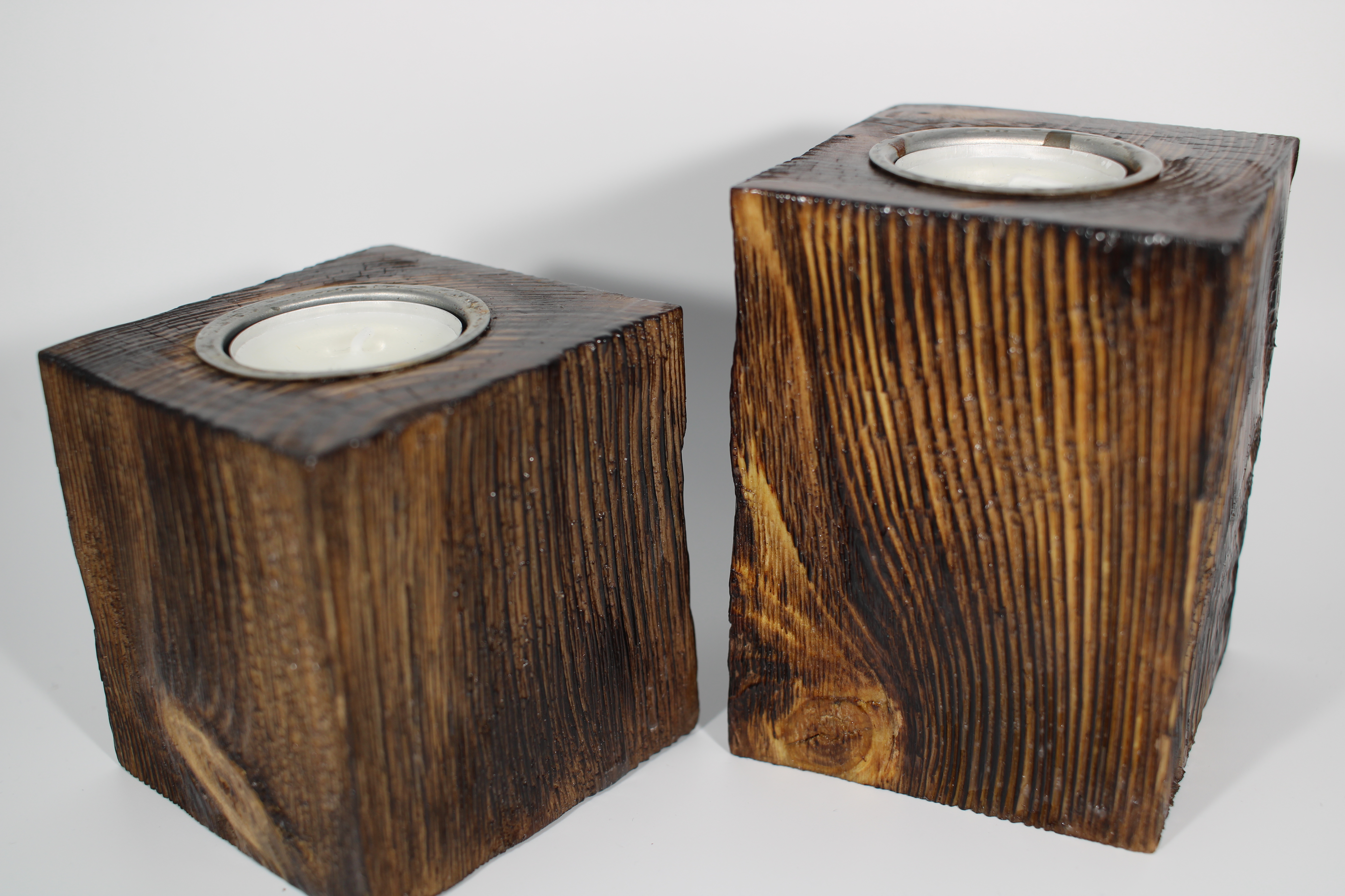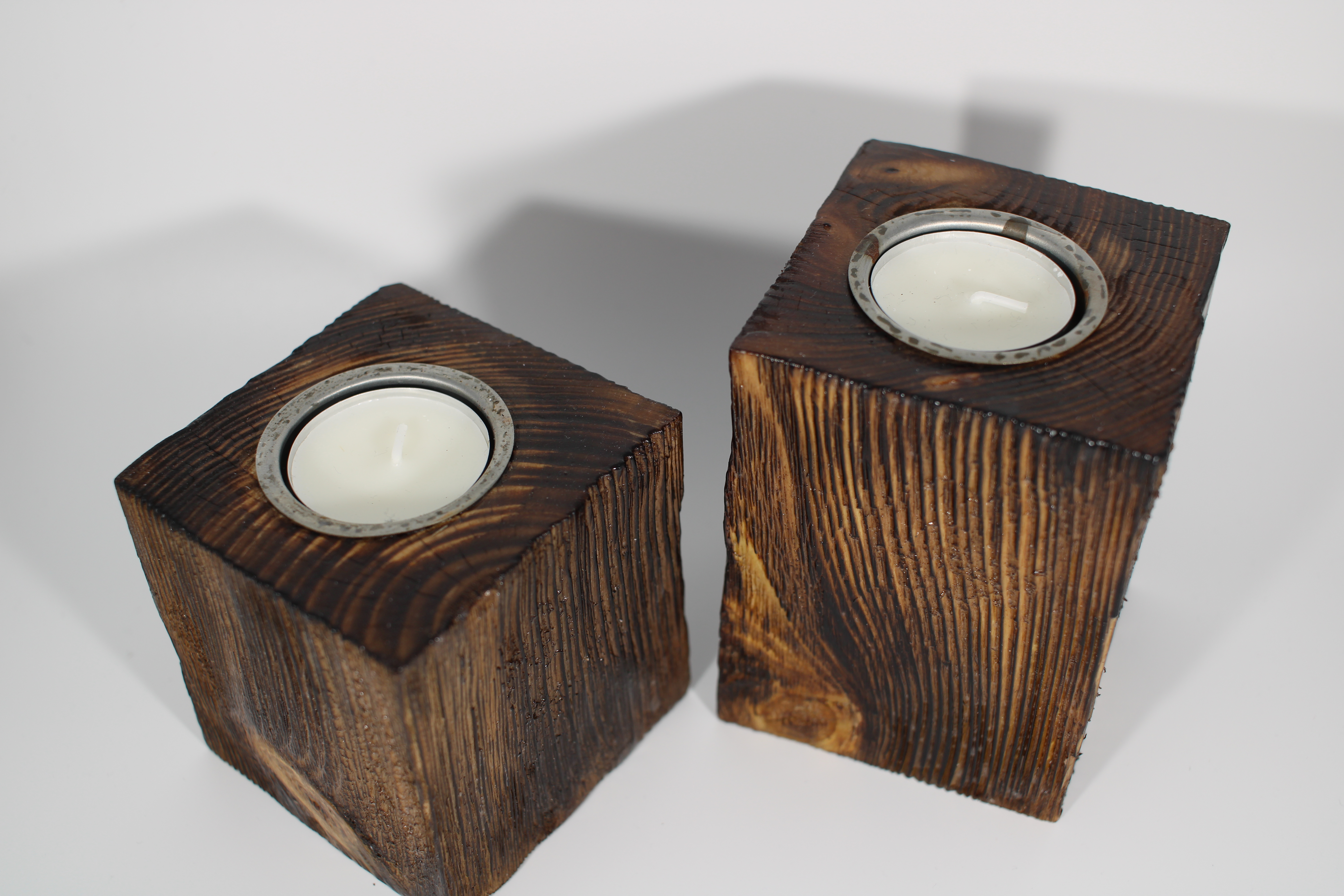 Holz mit Klarlack lackiert / Teelichhalter im 2er Set mit Teelichtern.