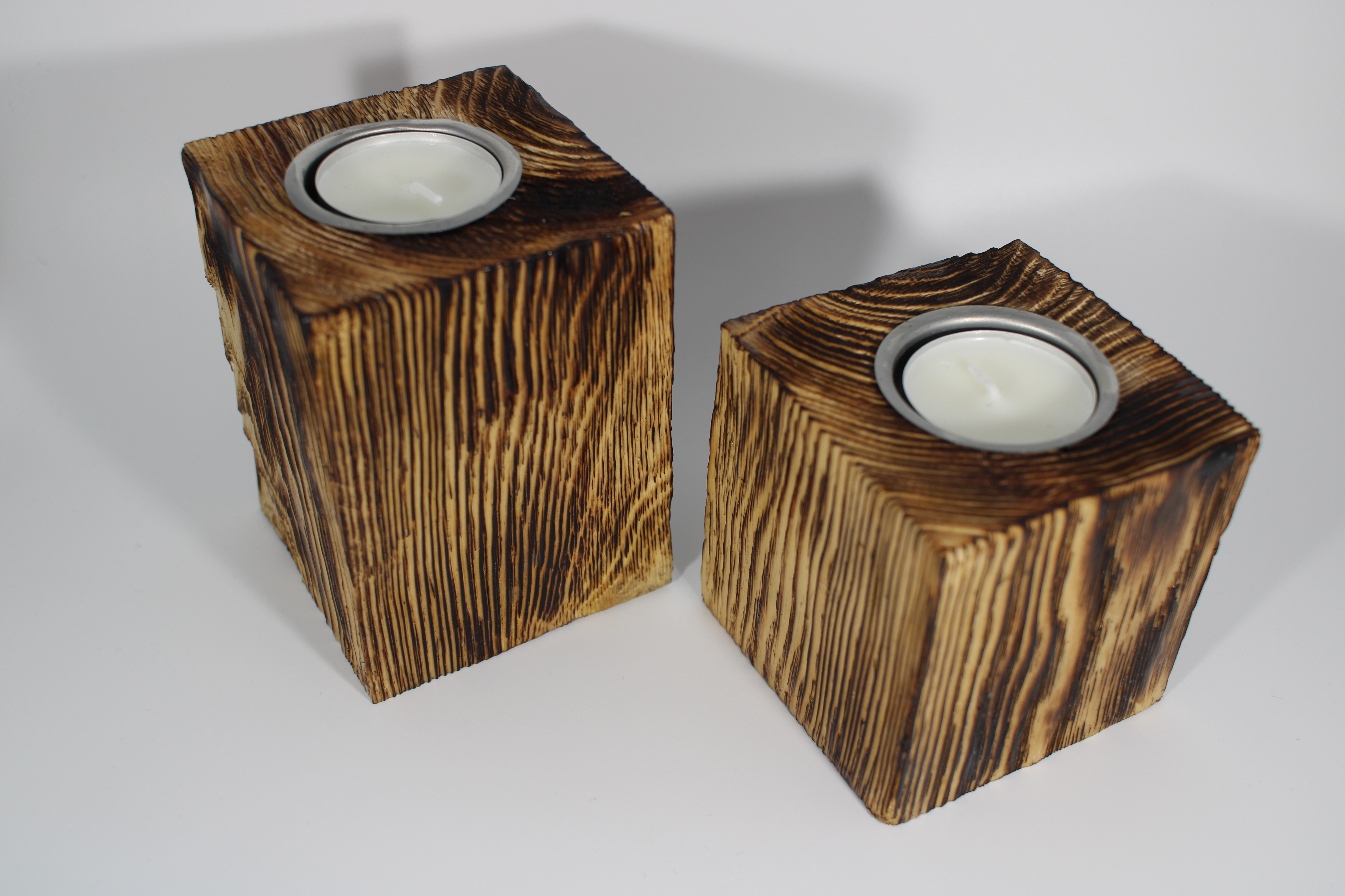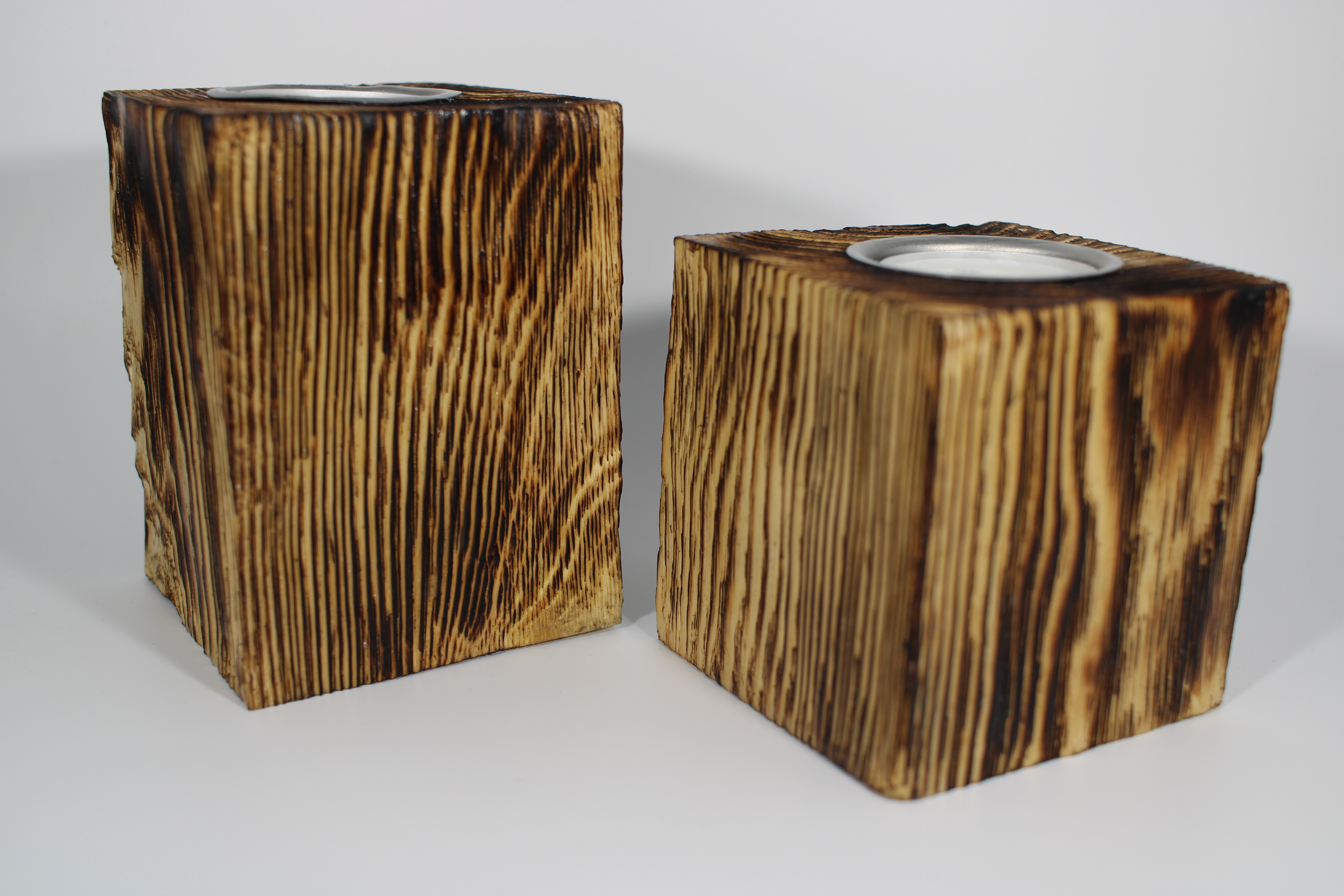 Holz mit Klarlack lackiert / Teelichhalter im 2er Set mit Teelichtern.